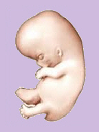 12 uger - Stemmebåndet er udviklet og babyen kan til tider græde lydløst. Hjernen er fuldt dannet, og babyen kan også føle smerte. Fosteret kan endda sutte på tommelfingeren. Øjenlågene dækker nu øjnene, og vil forblive lukket, indtil den syvende måned, for at beskytte de skrøbelige optiske nervefibre. Håret er nu på hovedet og fingre og tæer har udviklet bløde negle. Nyrerne er udviklet og begynder at udskille urin.